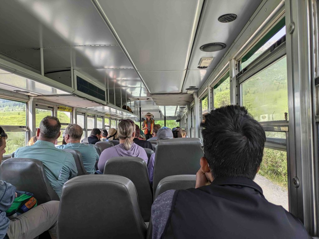 There wasn’t much commentary on the return ride, but we saw a few people wanting to hop into the bus. These were hikers who had arrived earlier in the day and wanted to catch a ride back to the bus depot. Since none of the passengers inside had stepped out of the bus, there was minimal space in ours – we had to leave behind the folks at the bus stop for subsequent buses to pick them up. There was one solo hiker who got in, and then in another stop, a couple hopped in – they said they saw a few caribou, a couple of moose and a brown grizzly bear at a distance. They did have binoculars, and they even had the hiking poles.