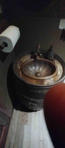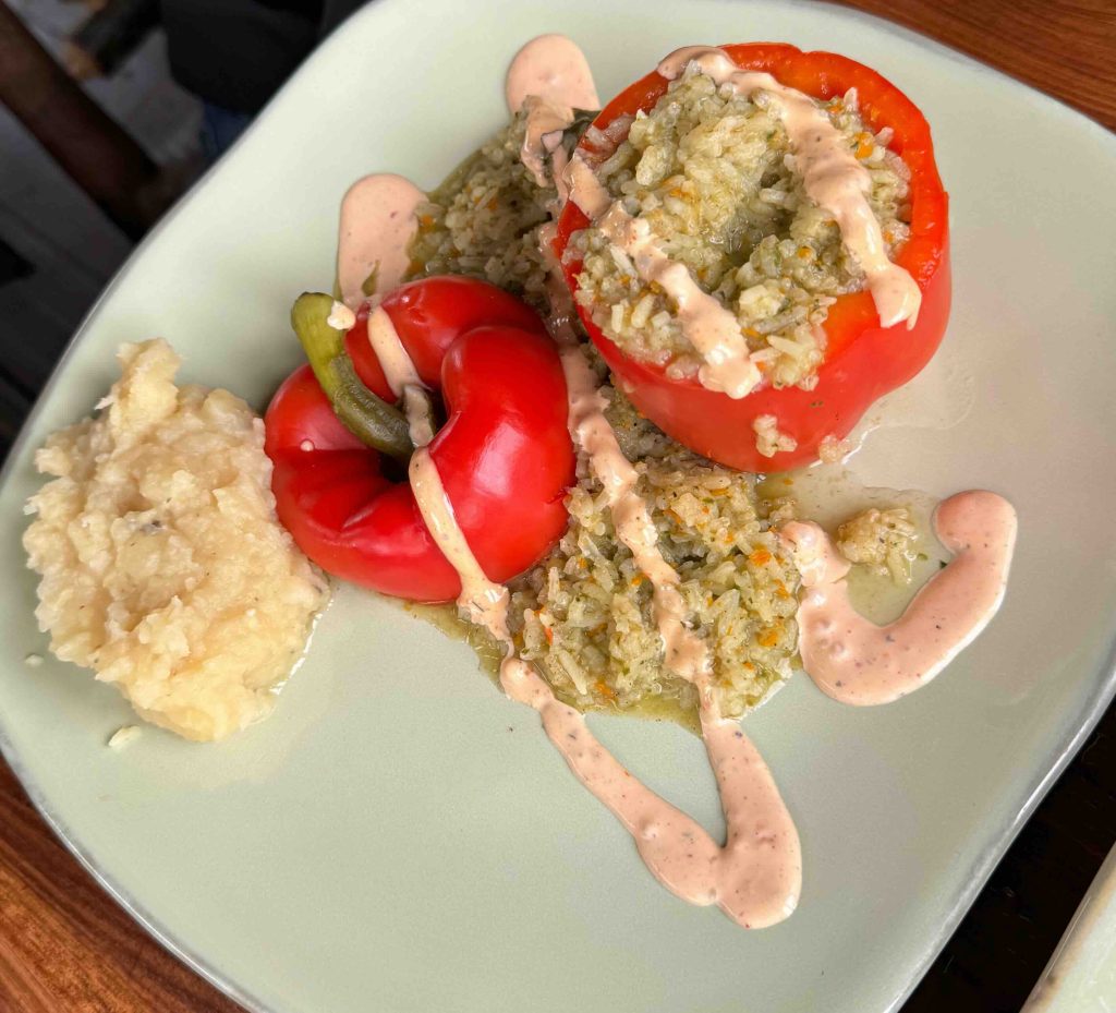 Rajesh and Moorthy ordered a couple of drinks (chocolate martini and a mimosa); we did the Mekice (fried bread with a red pepper spread), vegan stuffed pepper (red bell pepper stuffed with fillings and rice), pillici pilaf (chicken pilaf), grandmother’s chocolate cake. All the dishes were good – the pepper spread was unique and yummy. We usually don’t order standard desserts, like chocolate cake, but here, we went for it based on the description in the menu for the grandma’s chocolate cake – and it turned out to be a very different chocolate cake from anything we’ve had because it was loaded with a lot of things in addition to chocolate – brazil nuts, almonds, coffee beans, coconut cream, peanut butter. Bill came to around $150. Good food, amazing service, and uniquely decorated interiors – even their bathroom is styled differently!