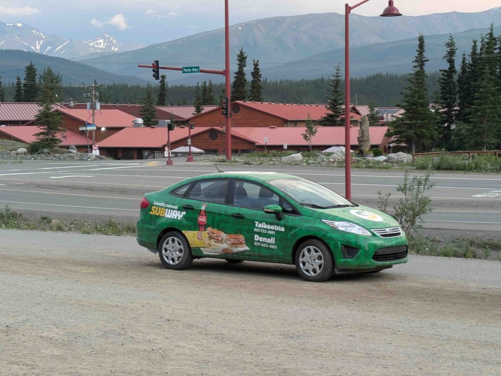 It was 11:30 pm when we were done. By now, everything around had closed, and on our return on the Parks Highway, where we had the row of stores in Denali, just one restaurant was open – Subway. They were open 24 hours. Outside the restaurant was a Subway painted car as well.